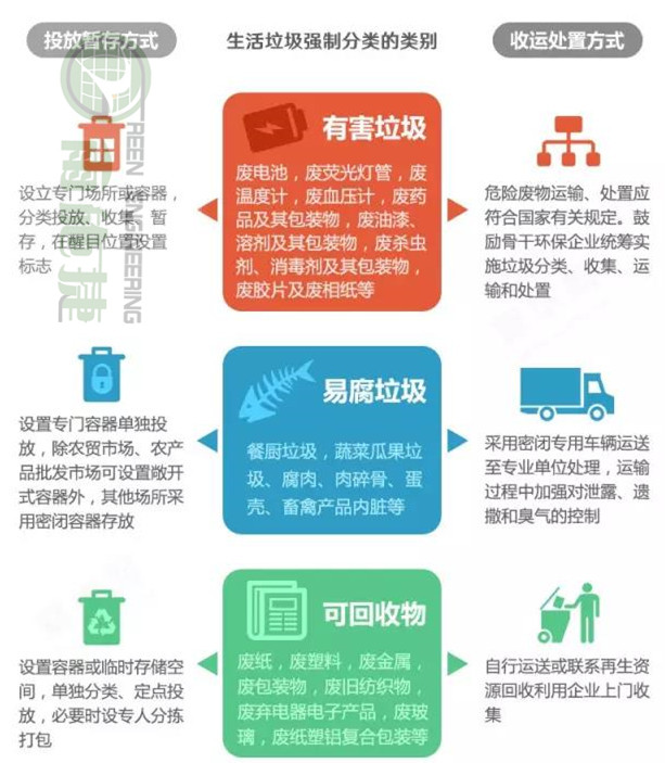此外,《方案》中要求,實(shí)施生活垃圾強(qiáng)制分類的城市要于2017年底前制定出臺(tái)辦法,細(xì)化垃圾分類類別、品種、投放、收運(yùn)、處置等方面要求。《方案》提到了三個(gè)分類:有害垃圾、易腐垃圾、可回收物。