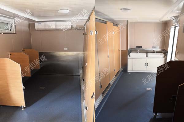 3、移動衛生間配有水箱,機動靈活,對外界水依賴性較小,廁所體積小,重量較輕,搬運方便,對機吊設備無依賴,小型衛生間3-4人即可對其進行搬運。
