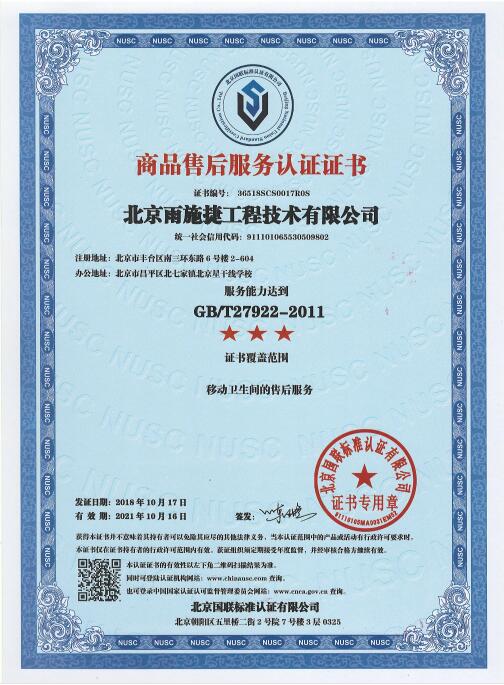 雨施捷移動衛生間商品售后服務認證證書,是對我們售后人員很大的認可。