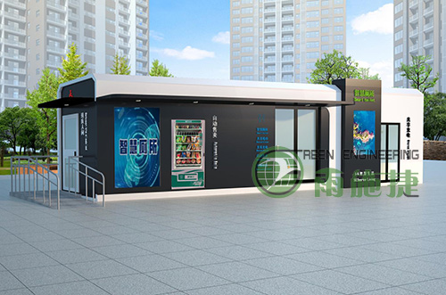 5G智慧公廁由多科技模塊組成,包含無水馬桶廁間模塊、無障磚衛生間模塊、運營商5G設施承載模塊、共享充電設備模塊、自助售貨模塊、室內中控展示屏模塊、智能可視化引導屏模塊、P4戶外120寸LED展示屏模塊、燈箱模塊等。4間無性別廁間,可供如廁使用。5G智慧公廁還配置空調、新風系統、電動感應門組、全覆蓋聲音提醒系統、遠程設備動態監管及警示、顯示引導屏組、空氣質量及煙霧實時數據監測、一鍵消殺系統、公廁外側24小時監控、百度地圖/微信小程序/APP“找廁所”、如廁共享 WIFI等功能。