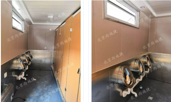 男廁里安裝的圓形智能感應不銹鋼小便池非常的美觀大方,為環保移動廁所增添亮點,