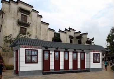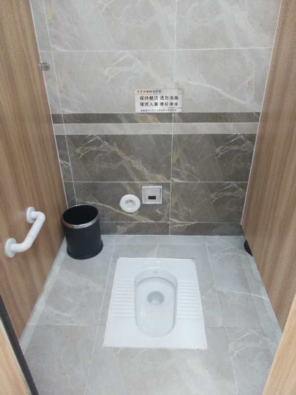 室內配置:不銹鋼水沖蹲便器、火燒板防滑地板、化妝鏡、衣帽鉤、手紙盒、廢紙簍、照明燈、換氣扇、指示牌等。